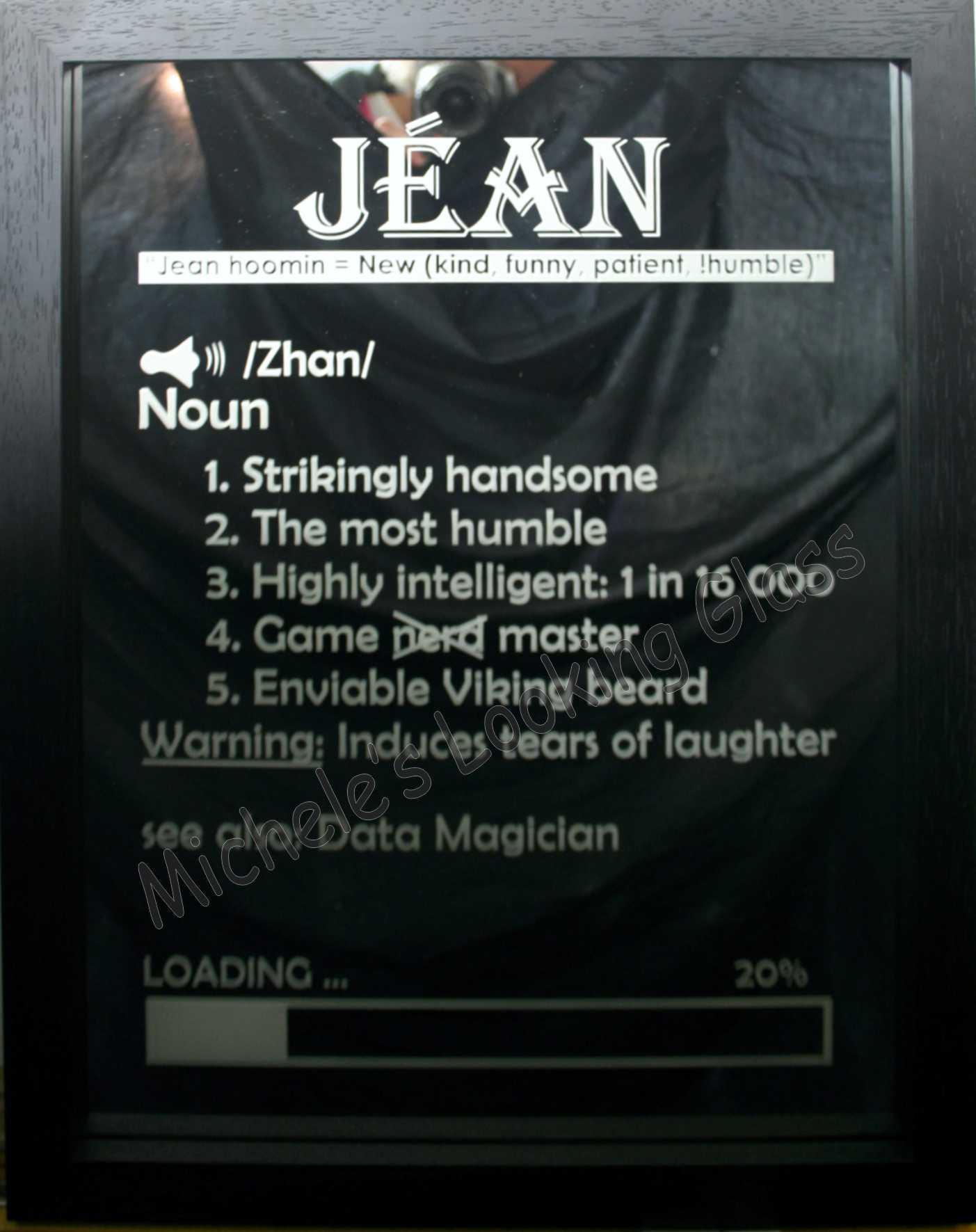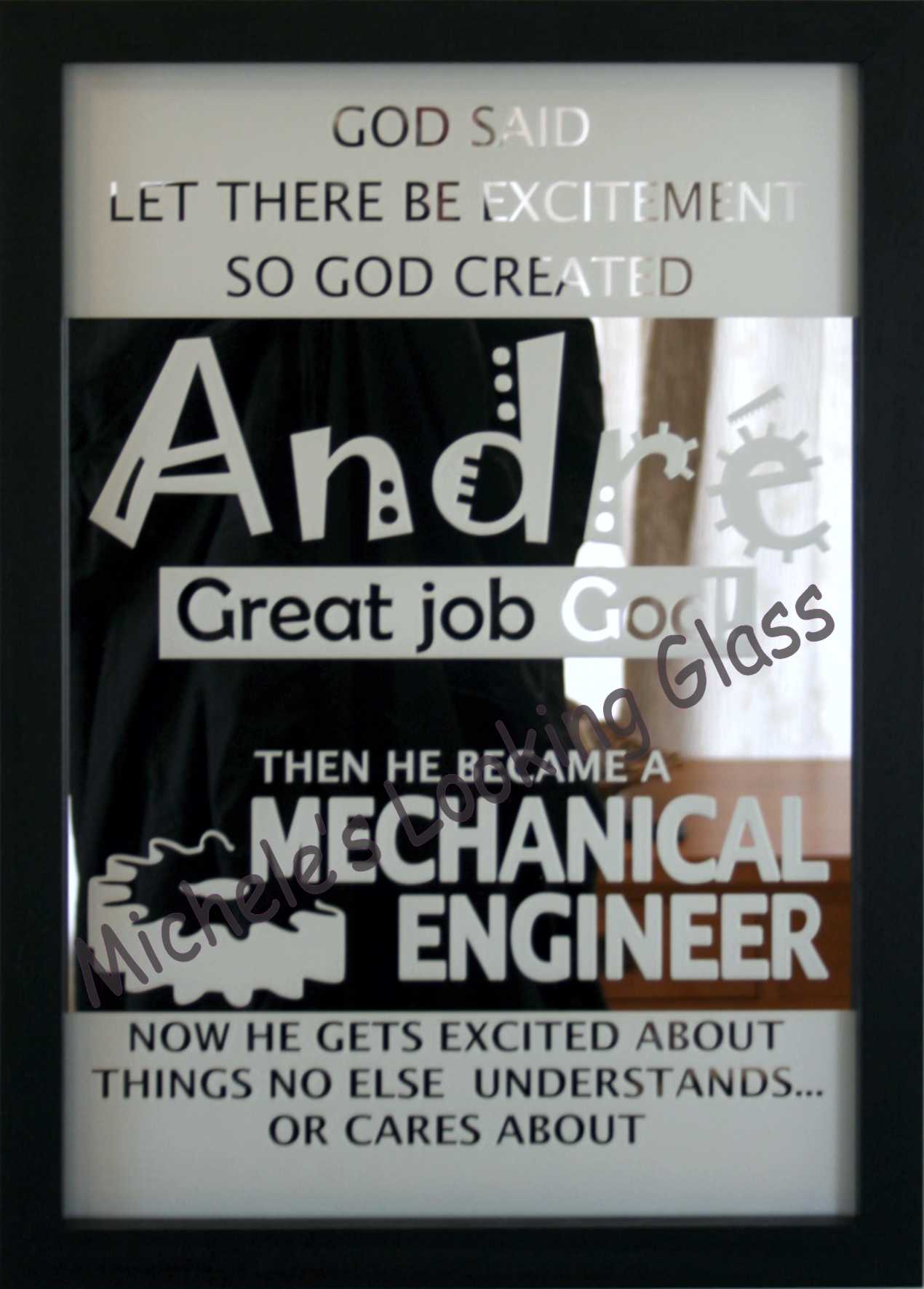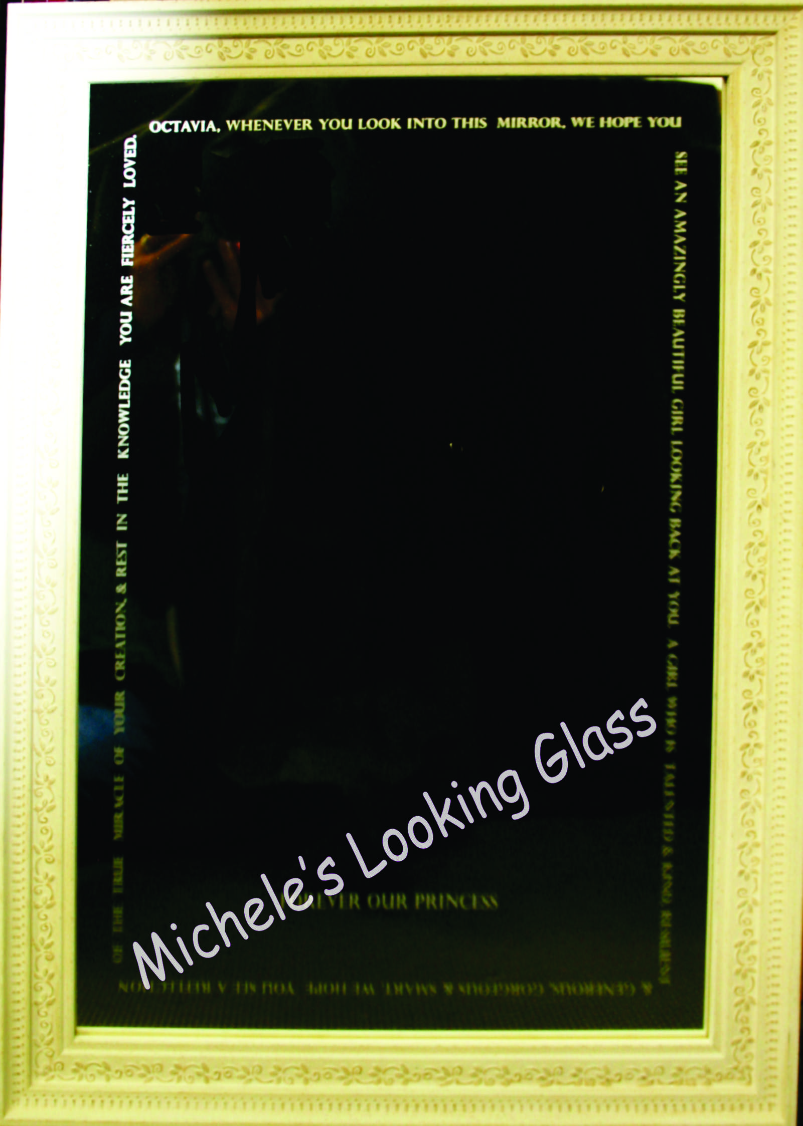 The twins turned 21 and this framed mirror was used at the function. The twins fought over the mirror, so the mom kept the original and they each got their own.